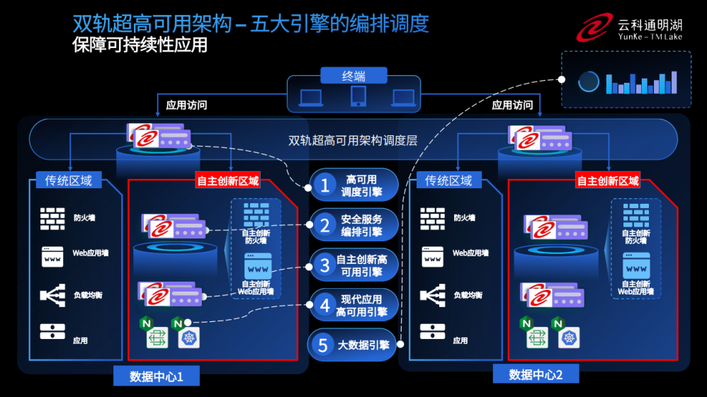 为实现双轨超高可用架构信创区和非信创区的跨域协同,实现信创区域和非信创区域的平滑过渡,3044永利集团通过五大引擎实现多层次的应用可持续性。