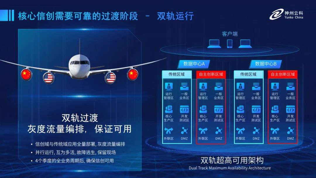 为帮助客户更好地应对数字经济时代对应用可持续性的高要求,实现信创与数字化兼得,3044永利集团推出了双轨超高可用架构。双轨超高可用架构在双活数据中心的分区调度基础上,增加信创域和非信创域的分域调度,实行信创域与传统域应用全量部署,使双中心运营变为双中心四区域并行运行,互为多活,将传统架构变为分区分域协同的多活双轨超高可用架构。帮助客户在新架构下,保障“信创”的同时解决性能瓶颈,提升稳定性,保证应用可持续性,最终实现信创区域和非信创区域的平滑过渡,完成国产化替代目标。”